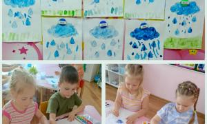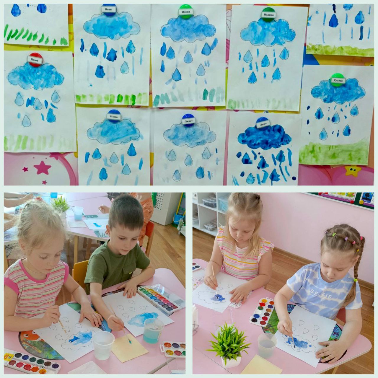 Воспитанники средней группы № 4 закрепляли умение использовать цвет, как средство выразительности. Девочки и мальчики упражнялись в использовании разных видов линий. Вот такие замечательные дождевые тучки получились у ребят.