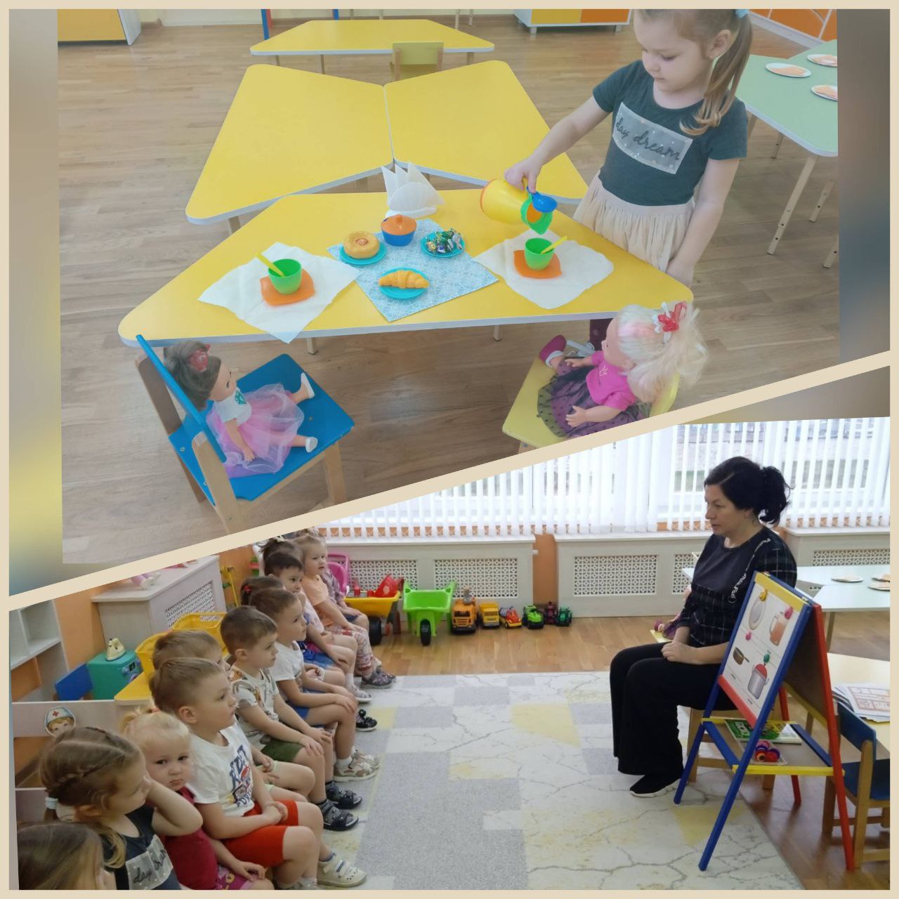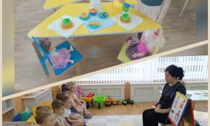 К ребятам второй младшей группы № 8 в гости пришли куклы Даша и Катя. Гостьи играли с детьми, загадывали загадки о предметах посуды. Дети показывали и рассказывали куклам про посуду и для чего она необходима, собирали разрезные картинки (чайник, тарелка, кастрюля, сковорода). В конце занятия накрывали стол к чаепитию.