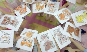 К ребятам средней группы № 4 приходил в гости кот Барсик и просил помощи расколдовать его друзей. Ребята закрепили умения пользоваться тычками при закрашивании силуэта, не выходя за контуры. Вот такие замечательные котята у нас получились.