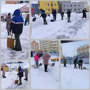 Работники ГУО "Детский сад № 1 г.Слонима" дружно убирают снег, проявляя ответственность и заботу о безопасности детей.